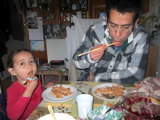 I was in quite a good shape this morning, I helped in the Noah's Ark shop, I steamed and steamed, I already told and confessed my fascination for the repetitive jobs. Only in the afternoon the energies vanished, nothing that could not be sort out with an hour nap, It was great to feel the subconscious taking over of the conscious and the legs slowly release from the body. Today we did not have any going out, rarely we stay at home all day as today, I found the going out very helpful and therapeutic, or at least it makes me divert from some of the thoughts. Probably it also means that I still need to find my peace in between the walls of my house and do not constantly run away from it. It is the patience of Chinese that we all need to have and practise. But before practise the patience from China we practise the eating, In the dinner we all picked up the chopsticks. Olivia loved the new fashion.